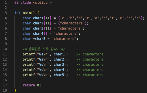문자열을 선언하는 다양한 방법 문자열의 맨 마지막에는 널 문자가 들어가기 때문에, 문자열 배열의 크기는 문자열의 길이 + 1 로 설정해 주어야 한다.