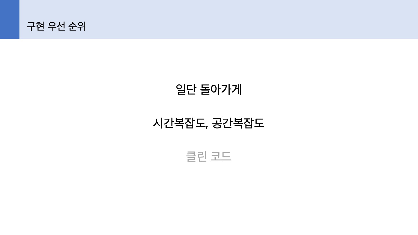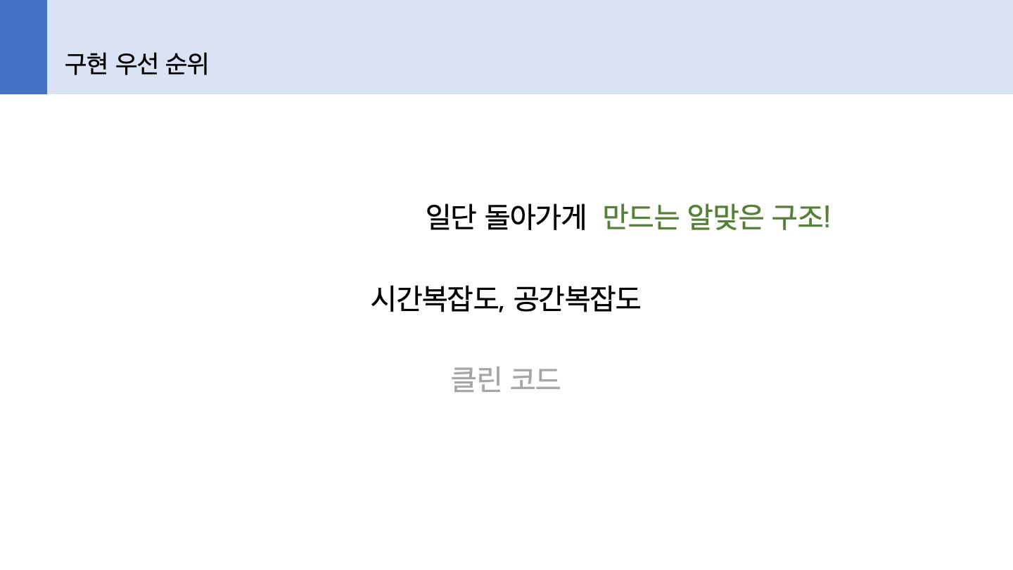 클린 코드를 작성하는 능력이 날이 갈수록 중요해지고 있지만, 아무리 읽기 쉬운 코드라고 해도 문제를 해결하지 못하거나 시간복잡도가 높다면 좋은 코드라고 할 수 없다. 즉, 클린 코드는 우선순위가 높지 않으므로 제일 나중에 고려해도 되는 문제라는 것이다.